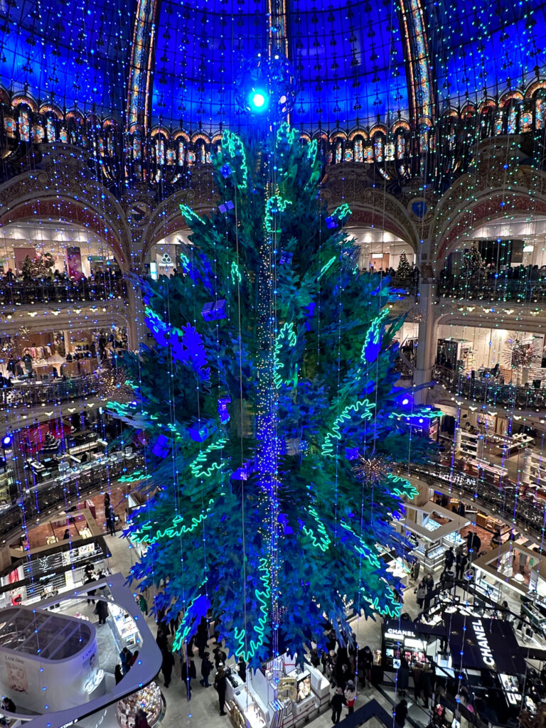 Reopened in 2021 following years and years of renovation and legal battles with the city of Paris, the LVMH owned Samaritane has plenty to snap pictures of with their elevated, upscale decor. Don’t miss going to the top floor and looking down while there. This year they have a cute Christmas tree on the lower level that’s good for a photo opp, too.
