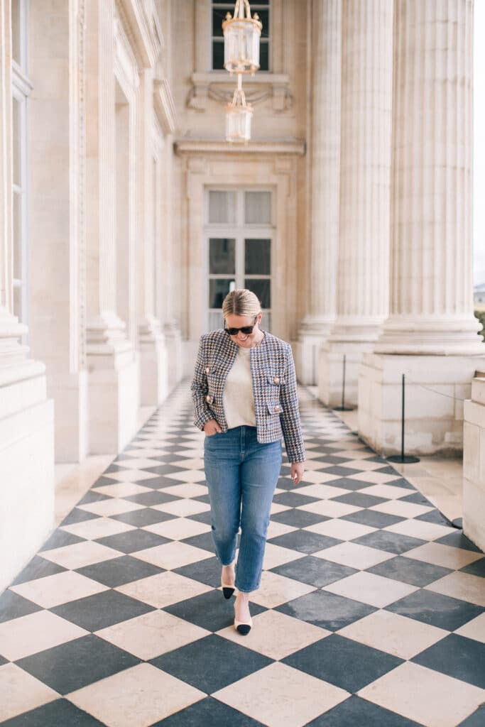 This outfit is in regularly rotation for me nearly year round. I love to take my collection of tweed blazers and jackets and pair them with jeans and the slingbacks.